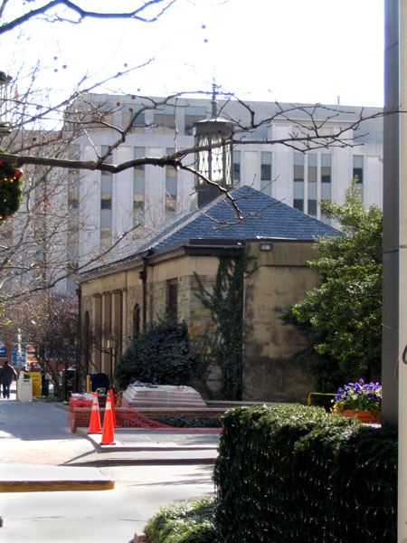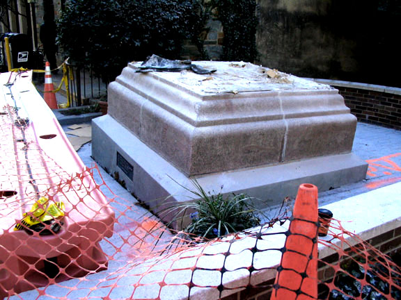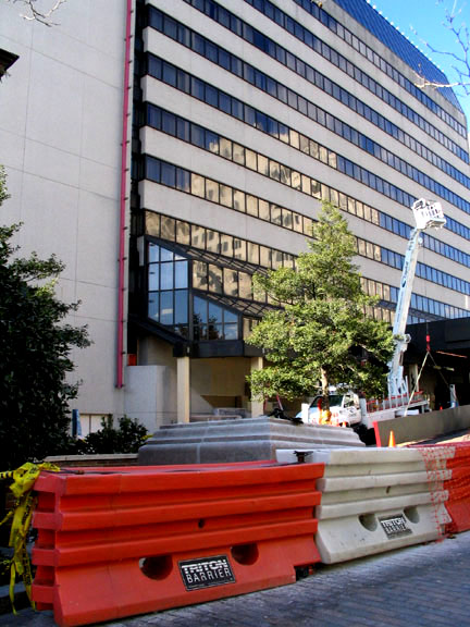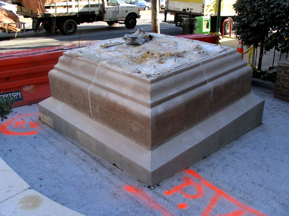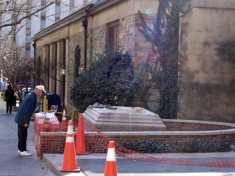| The Bethesda Madonna of the Trail statue began to list forward and to the right on Thursday, Dec. 9th, 2004 as a sinkhole developed near the Bethesda Post Office caused by a broken watermain. | ||
